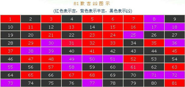 还有一种测算吉凶的方法是1到81个数字来论吉凶,是根据五格剖象取名法而来,把人的姓名按五格即天格为根、地格花、人格为苗、外格为叶与总格为果,再根据1到81个数字来论吉凶,这种取名的方法据说是中国的易经传到日本再由日本返传回中国的一种取名方法,其吉凶的判断依据就是按名字的笔画算出五格而定出吉凶,实际和周易文化中的数理没有什么太大的关系,在懂周易文化人士眼中这种取名方法基本是被否认了的,这81个数字图如下:
