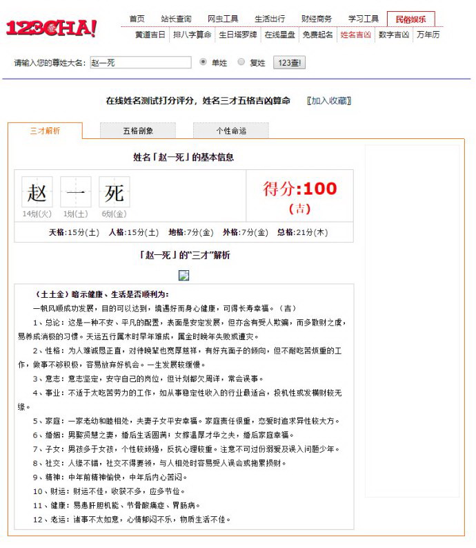 再提出一点的是网上所谓的测名字打分主要根据五格剖象取名方法编制的程序做的,大家可以作为游戏不可以相信其应验率,如下这个图片就是根据五格剖象取的名字赵一死,这个名字显然是不会有人会用的,但是却在网上查可以得100高分的好名字,所以建议大家不要在网上查自己名字的吉凶添加烦恼。